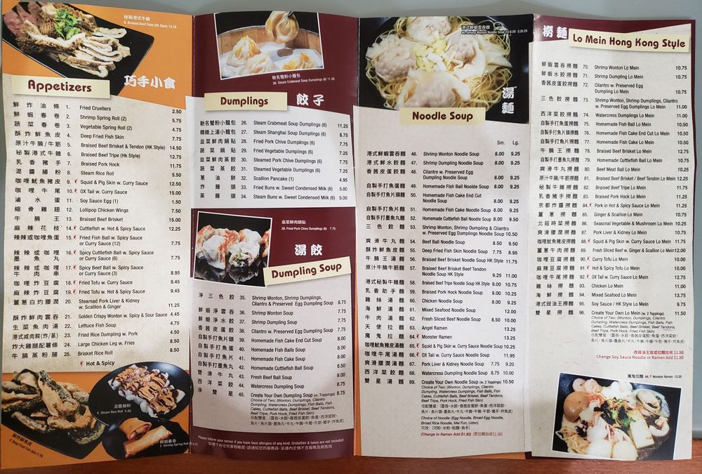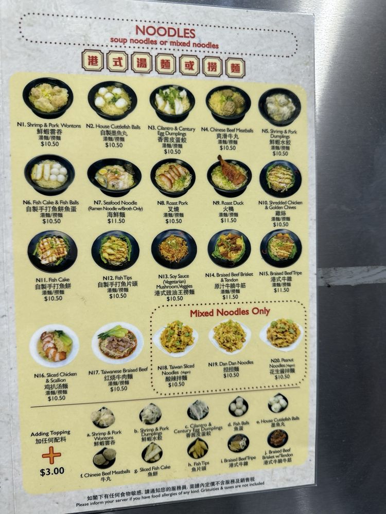 Choice of Noodle 麵類選項 (Egg Noodle 蛋面, Broad Egg Noodle 寬蛋麵, Broad Rice Noodle 河粉, Mei Fun 米粉, Udon 烏冬, Ramen 拉麵 +$). Choose toppings: Wonton, Dumplings (Cilantro, Watercress), Fish Balls, Fish Cakes, Cuttlefish Balls, Beef Brisket, Beef Tendon, Beef Tripe, Pork Hock, Fried Fish Skin.