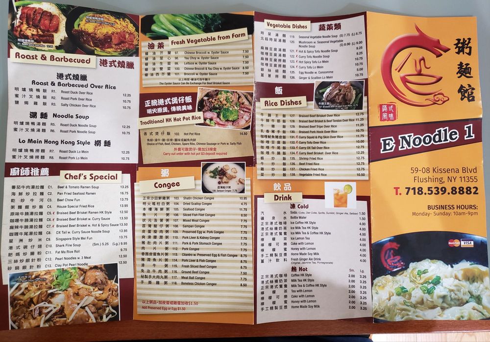 Located in Flushing, NY, E Noodle House offers a taste of authentic Cantonese comfort food. With a cozy ambiance and friendly service, this restaurant is a go-to spot for quick takeout or a casual dine-in experience. The menu boasts a variety of delicious dishes, such as wontons, congee, clay pot rice with spare ribs, and lo mein with wonton and beef tendon. Customers rave about the flavorful food, especially the duck, roast pork over noodles, and vegetable dumplings. The prices are fair, and the portions may be small but satisfying. With options for meat lovers and vegetarians alike, E Noodle House is a must-visit for those craving delicious Cantonese noodles in a welcoming setting.